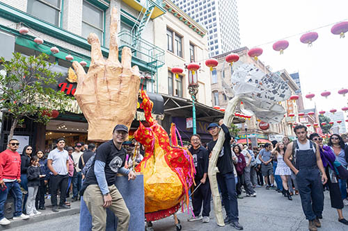During their visit in San Francisco, the Hong Kong artists - Lau Hok Shing, Hanison, Tang Kwok Hin and Art Together's Cheng Yee Man – hosted a series of events celebrating the Hungry Ghost Festival. Events organized by the artists included the Opening Exhibition “Ember”, “Dao of Hong Kong-style Jiao Festival: Documentary Screening and Ritual Explanations”, “Phantoms of the Haunted Realm: Hong Kong Ghost Storytelling”, “No Taboos: Ghost Talisman Drawing” and “Hundred Families Roasted Rice Tea”. The artists also participated in the Hungry Ghost Parade showcasing their papercraft artworks, namely “Heart. Ablaze”, “Red Chopsticks. Clam the Middle Finger” and “Running Horse”.